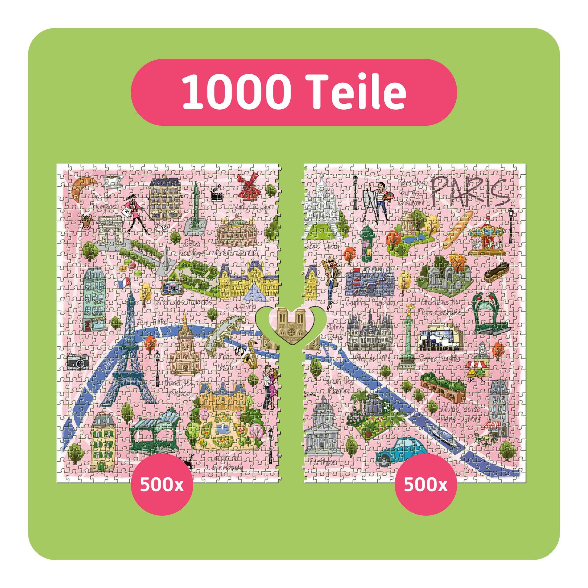 Paare und Freunde aufgepasst: Dieses TEAMPUZZLE ist für zwei gemacht und nimmt euch mit auf eine Reise durch die französische Hauptstadt. Das Motiv zeigt einen liebevoll illustrierten Stadtplan von Paris – mit all seinen Sehenswürdigkeiten, besonderen Orten und Momenten, die die Stadt ausmachen. Ein TEAMPUZZLE, das Gespräche weckt – über eigene Erlebnisse, Lieblingsorte oder die Vorfreude auf einen nächsten Besuch. Perfekt für alle, die Paris lieben – oder es noch entdecken möchten.