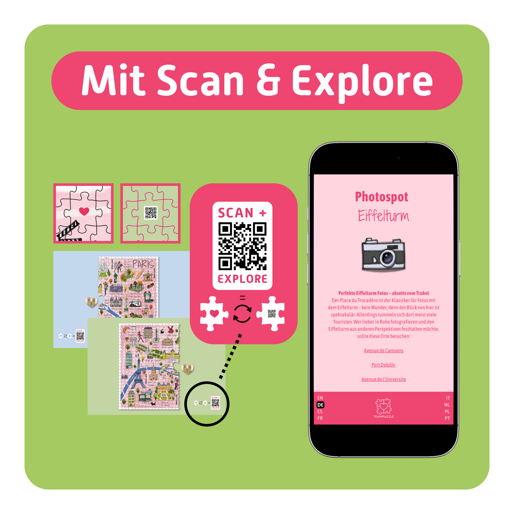 • Mit Search & Explore: QR-Codes auf der Rückseite mit Geheimtipps, Fotospots und Lieblingsorten in Paris