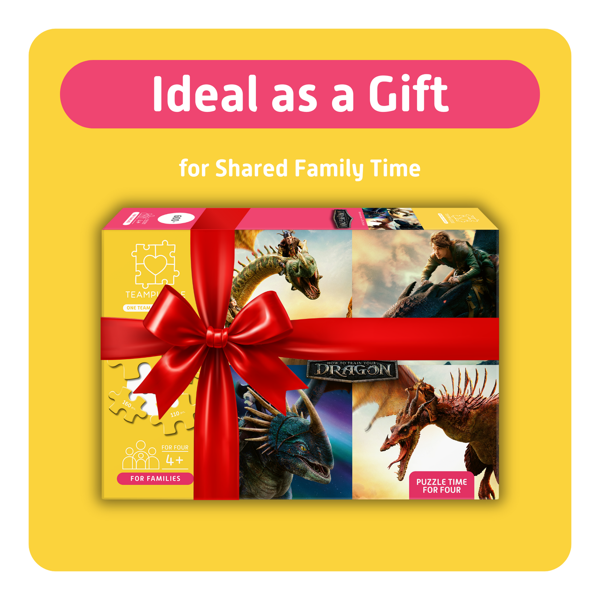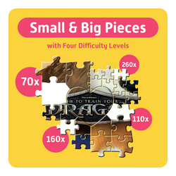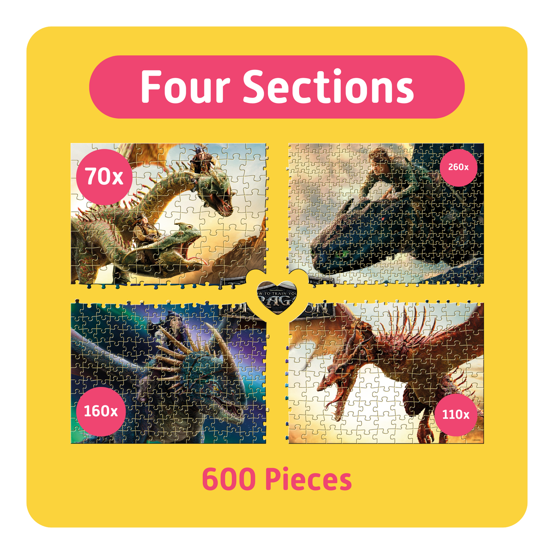 With the 600-piece version, puzzling together is taken even further. Instead of two sections, the scene is divided into four sections. Each section offers its own difficulty level — from large, easy-to-grip pieces for children ages 4 and up to smaller, more challenging sections for older puzzlers like parents, grandparents, or older siblings.