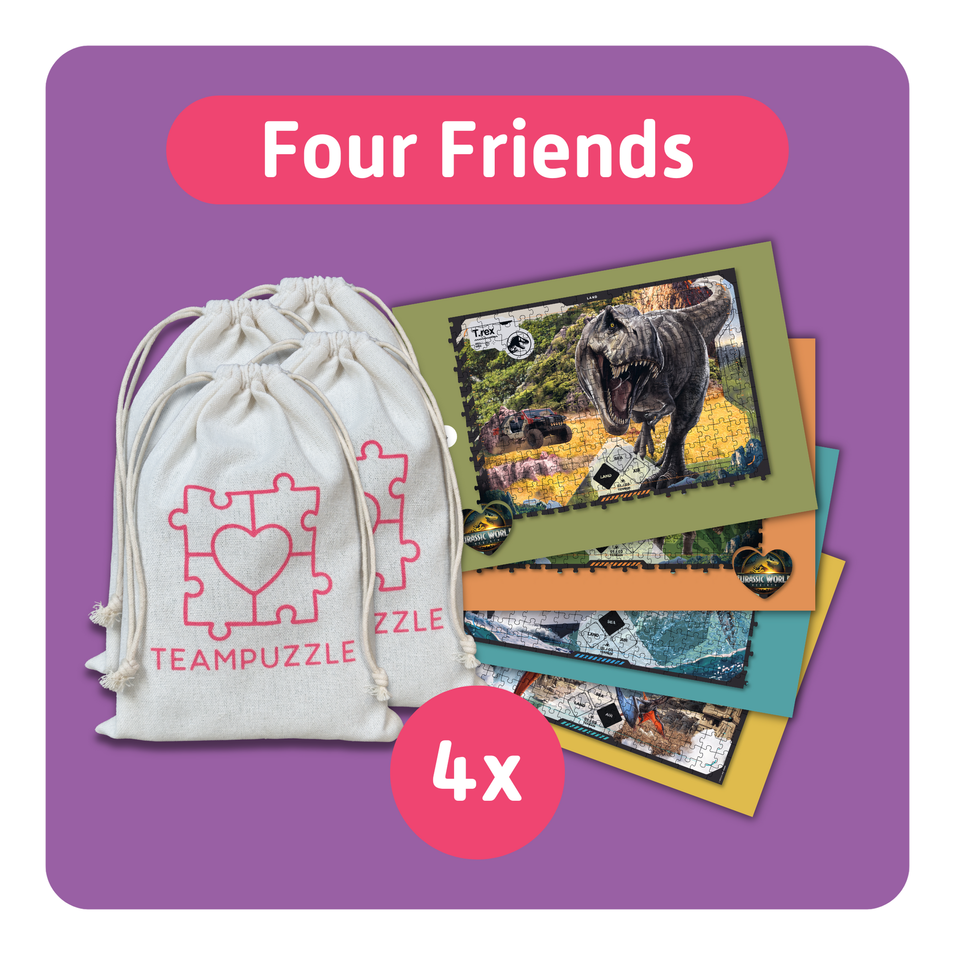 Four players. Four worlds. One puzzle — with an optional twist of action. With this TEAMPUZZLE For Friends, dive into the world of Jurassic World and experience dinosaurs on land, in the water, and in the air. Four striking scenes bring epic moments from the age of prehistoric giants straight to the table. For even more excitement, the free game app shakes things up and turns classic puzzling on its head. Your next game night with friends? Ready when you are.