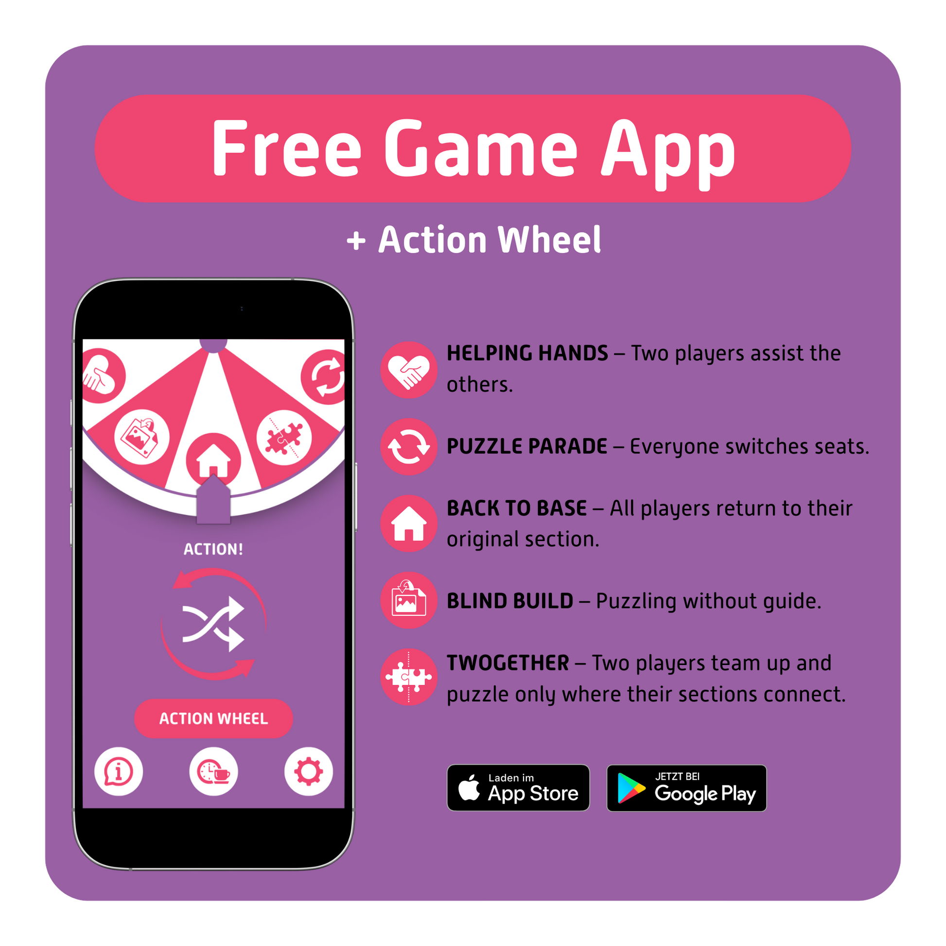 Want to add some action? The free game app brings energy to the table. Spin the Action Wheel for small challenges and unexpected twists — sometimes players switch places, sometimes reference posters disappear, and sometimes two players suddenly puzzle together. Every spin changes the game and turns the puzzle into an interactive experience.