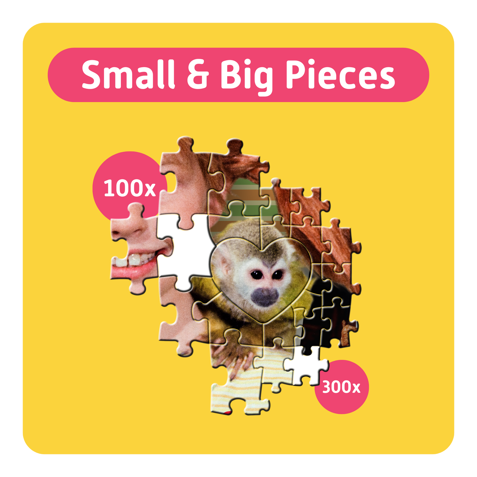 100 larger pieces for young explorers and 300 smaller pieces for their grown-up puzzling partners. Children and adults puzzle at the same time on their own section, meeting in the middle to place the heart-shaped center piece together.